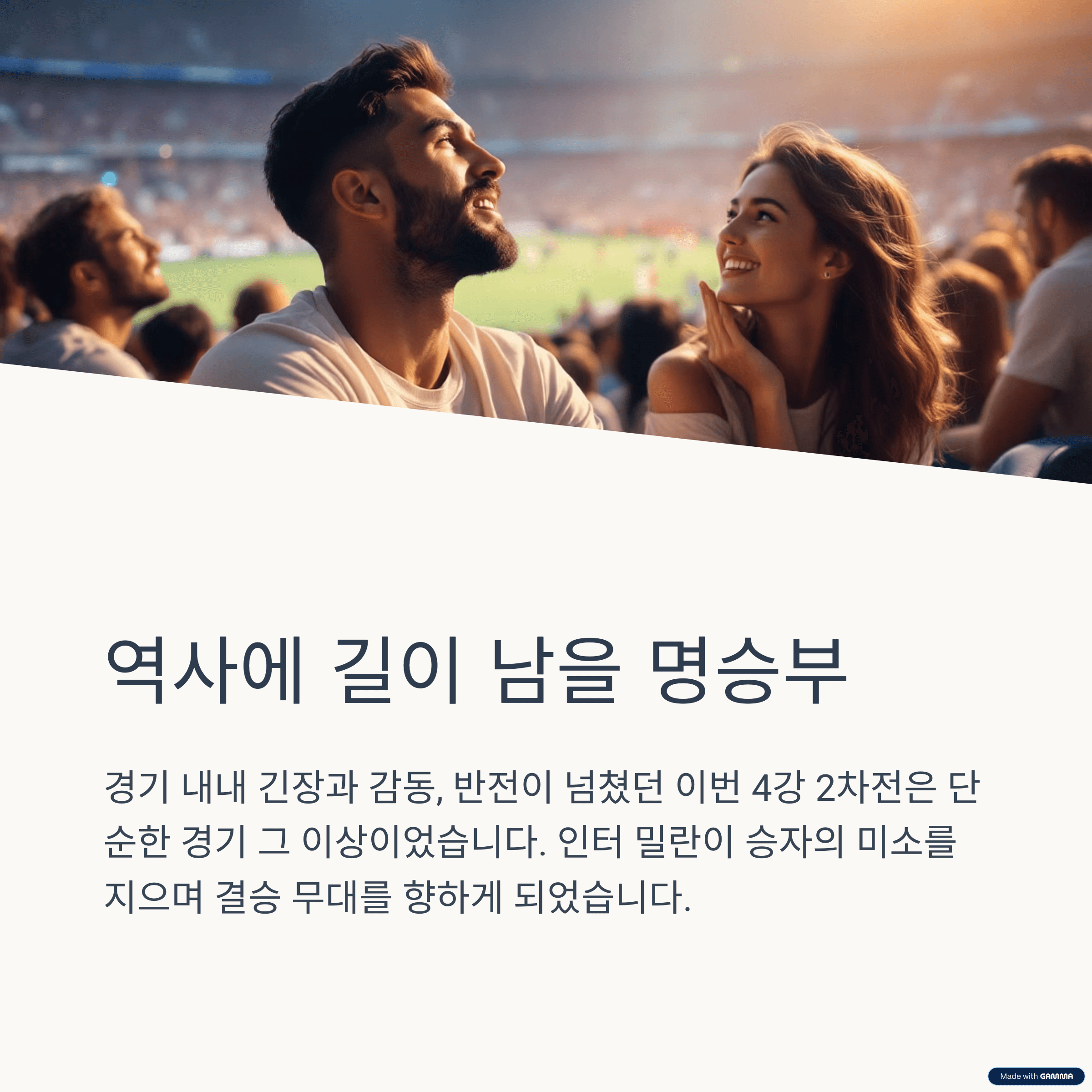 안녕하세요, 축구 팬 여러분! 드디어 챔피언스리그 4강전의 한 자리가 마무리되며 결승에 진출할 첫 번째 팀이 확정됐습니다. 바로 이탈리아의 인터 밀란이죠. 어젯밤 펼쳐진 바르셀로나와의 2차전은 정말 손에 땀을 쥐는, 역사에 길이 남을 명승부였어요. 전반부터 연장전까지 극적인 순간들이 이어졌고, 팬이라면 누구나 박수칠 수밖에 없는 경기였습니다. 오늘은 이 경기를 정리하며, 어떤 드라마가 펼쳐졌는지 함께 돌아보려 합니다.